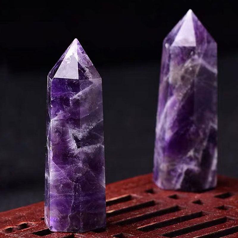 Dieses hexagonale Prisma besteht aus echtem Amethystkristall, der eine tiefe violette Färbungen besitzt. Bei der Kristallheilung ist es von großer Bedeutung, wie stark die Färbung des Kristalls ist, denn diese symbolisiert die Stärke des Steins.