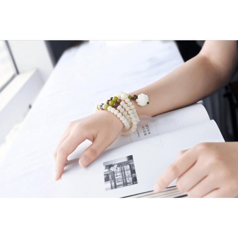 Im Sanskrit bedeutet der Begriff “Bodhi” “erwacht” oder “erleuchtet”. Jede Perle in diesem Mala Armband/Halskette besteht aus Samen von verschiedenen Bodhi Platzen, die im Buddhismus heilig sind. Diese Samen wurden so lange poliert, bis sie fast wie weißes Jade wirkt, daher auch der Name.